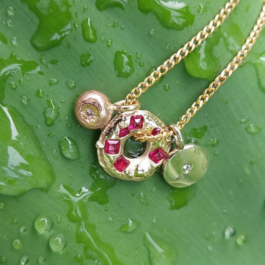 Each piece a celebration of nature's spontaneity and the artistry of cuttlefish or Sand casting. This distinctive technique ensures that no two pendants are alike, offering you a piece of jewellery as unique as you are. The organic process involves pouring molten metal directly onto precious gemstones like Diamonds, Rubies, and Sapphires.