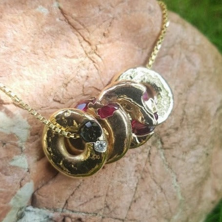 While the resilience of these selected gemstones allows them to withstand the heat, we prioritize the integrity of each piece by recommending against using the finest gemstones to mitigate the risk of cracking. Customize your pendant by specifying your preferred combination of gemstones, with the promise of at least one or two diamonds and the option to include up to 2 Sapphires or Rubies (there might be extras). Share your preferences in the designated area and embark on a journey to co-create your wearable piece of art.