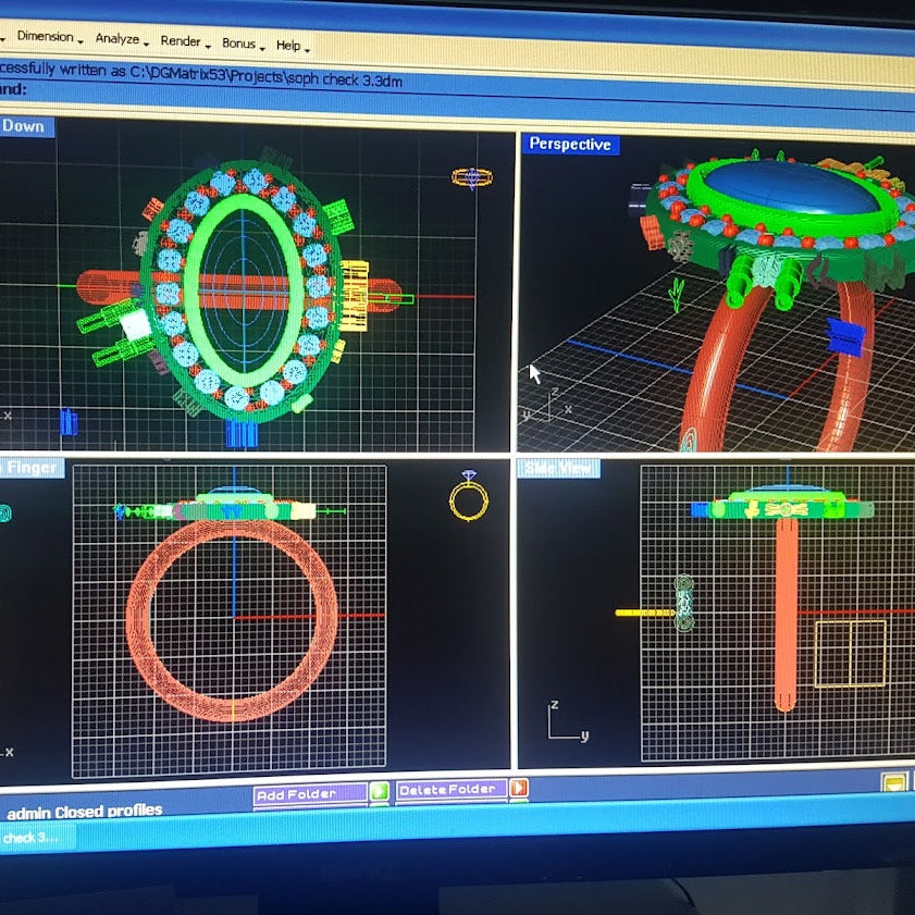 The ring was designed in CAD by Neeni, with a series of indigenous-inspired symbols incorporated around the top of the setting. The band was sand-cast, giving the piece strength, durability, and a subtle organic finish.