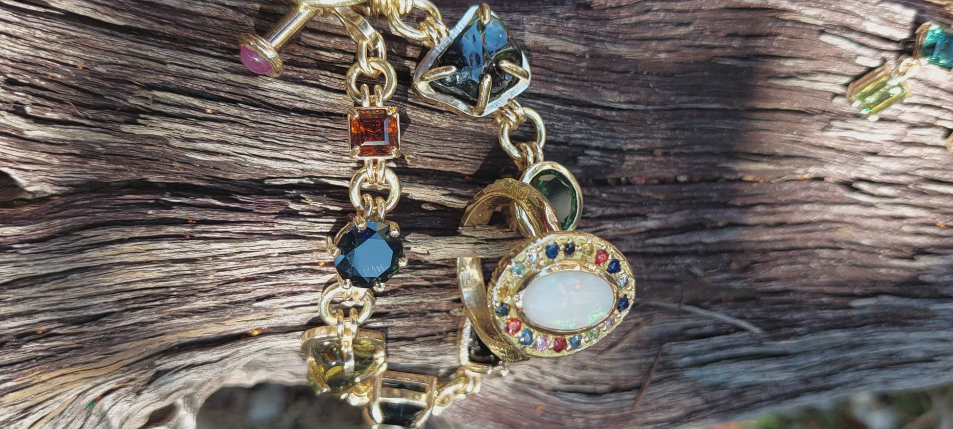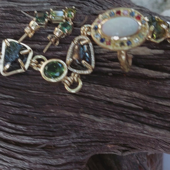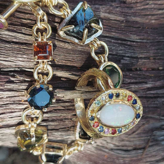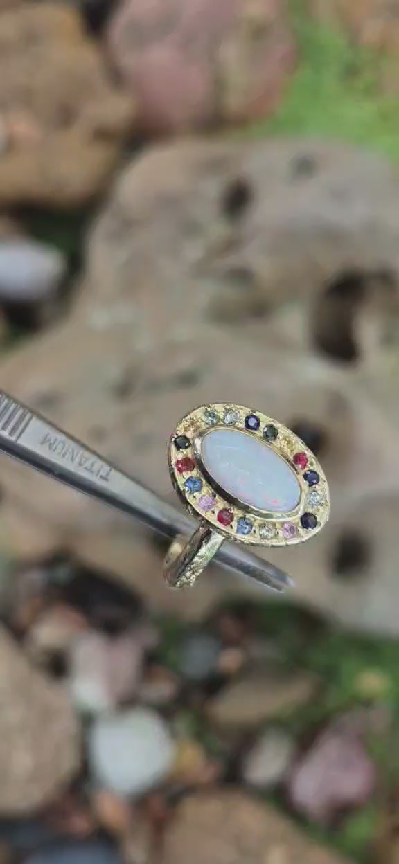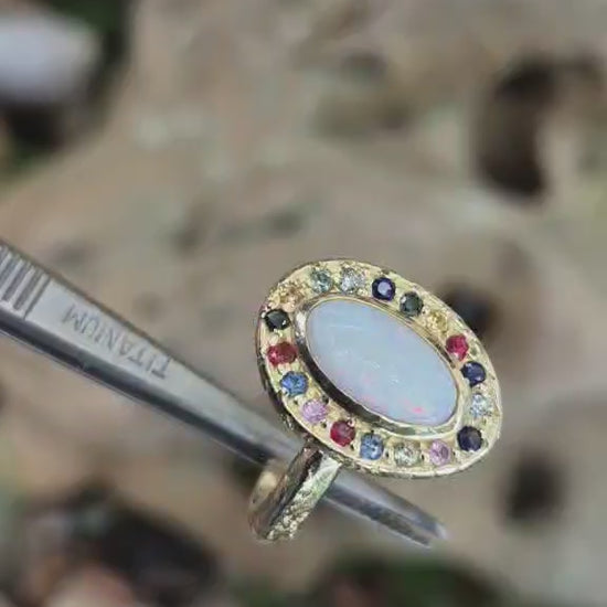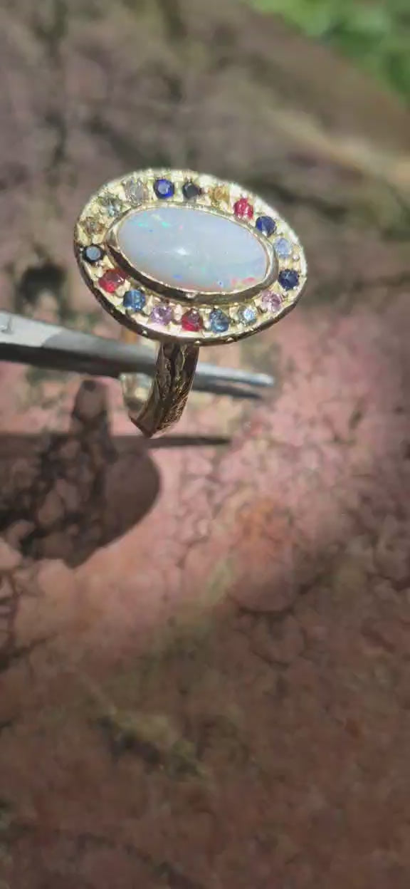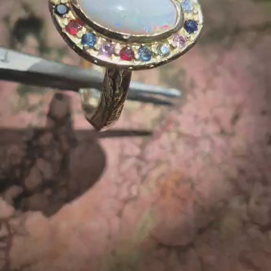 This ring features a natural white opal from Coober Pedy, originally found by the wearer’s father as a teenager and gifted to his daughter over twenty years later. The opal is surrounded by coloured sapphires and diamonds, selected to complement its natural play of colour.