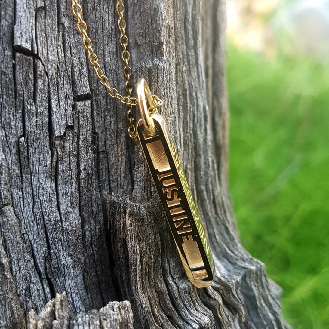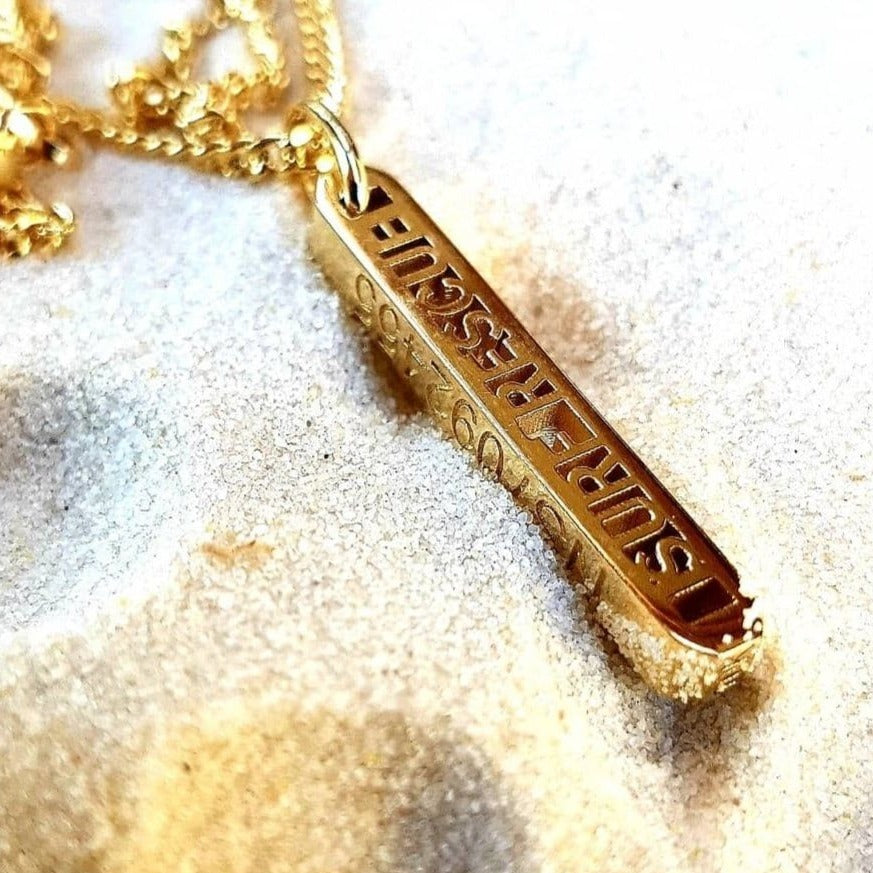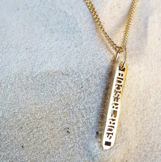 Customizable Surf rescue charm in 10k yellow gold featuring your name, bronze number, club name? There are four sides to create your unique text onto. If you would like to explore different metal options, please contact Neeni for any and all enquiries. This pendant featured comes with a 45cm 9k curb chain.